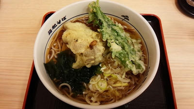 水曜の朝飯に「舞茸・春菊天そば」480円。