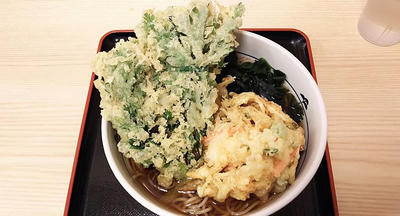 「貝柱のミニかき揚げ天と春菊天そば」480円。