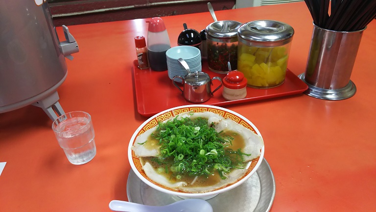 カウンターの上の台に置かれた刻みネギと唐辛子を好きに使える。
